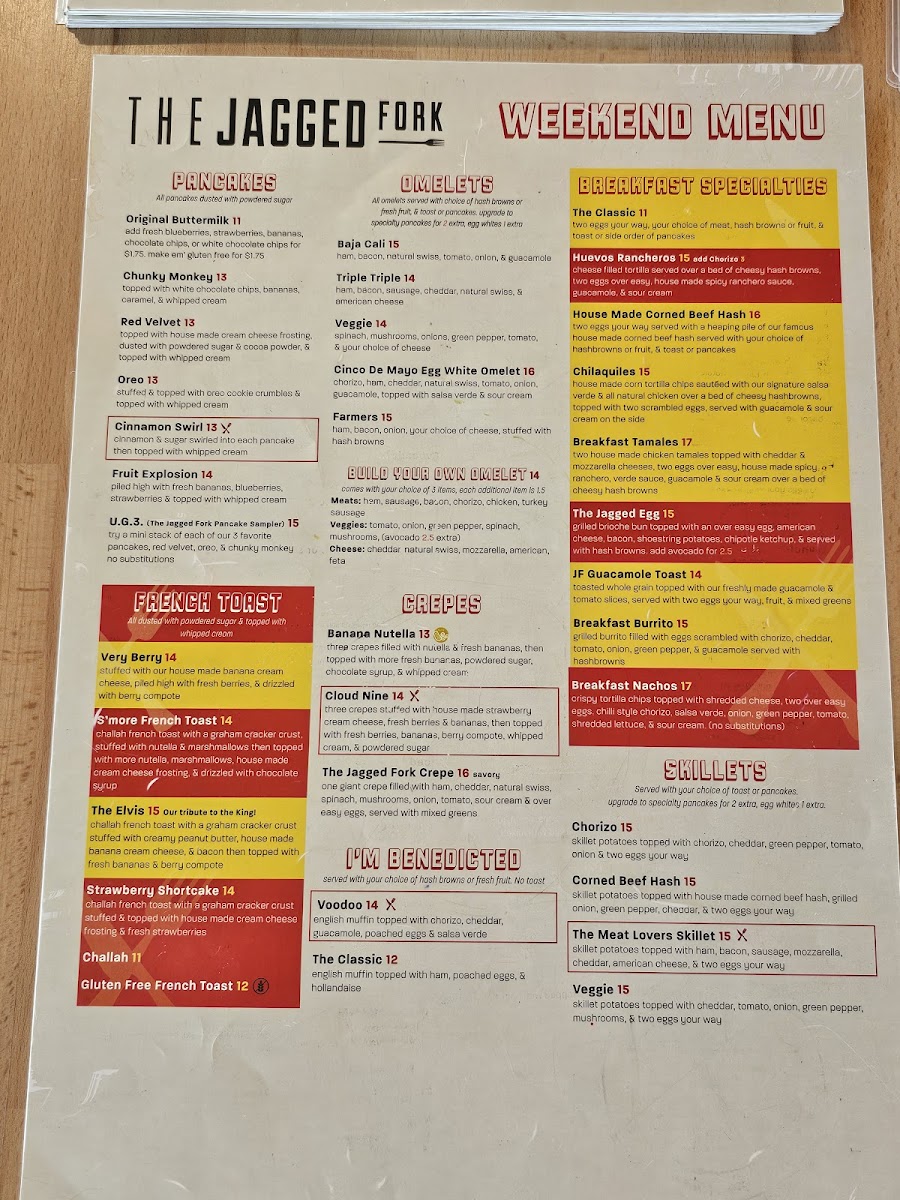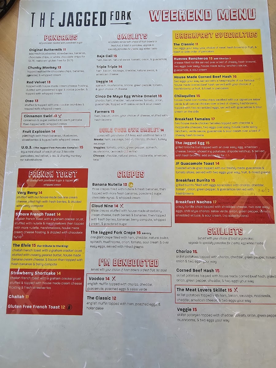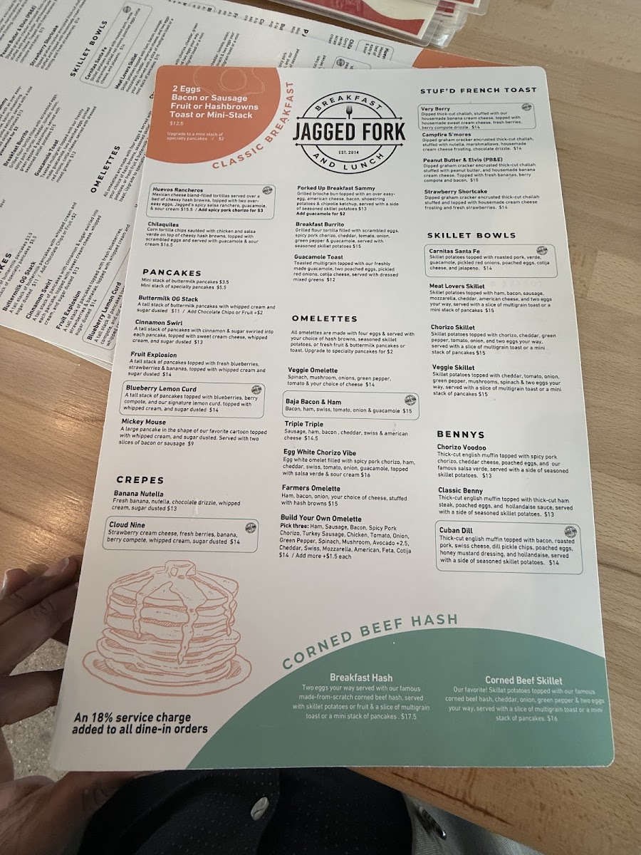 Breakfast favorites like red velvet pancakes, cinnamon pancakes, and the signature Jagged Fork crepe provide a warm start to the day, while hearty options such as the Greek skillet or the breakfast burrito offer satisfying flavors for those looking to enjoy a fuller meal. Handhelds like the chicken quesadilla or the Ultimate Quesadilla make it easy to grab a casual, flavorful lunch, pairing well with housemade drinks including freshly squeezed orange juice or a smooth cortado.